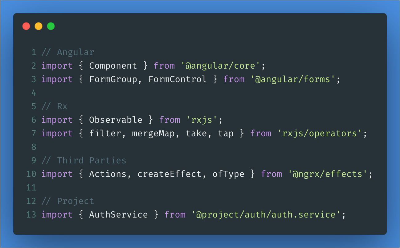 Keeping your file imports ordered and neat is challenging, especially when using an IDE to auto-add them as you type. As your files grow, they tend to get quite messy.This how I order my imports:- 1. Angular imports always go at the top