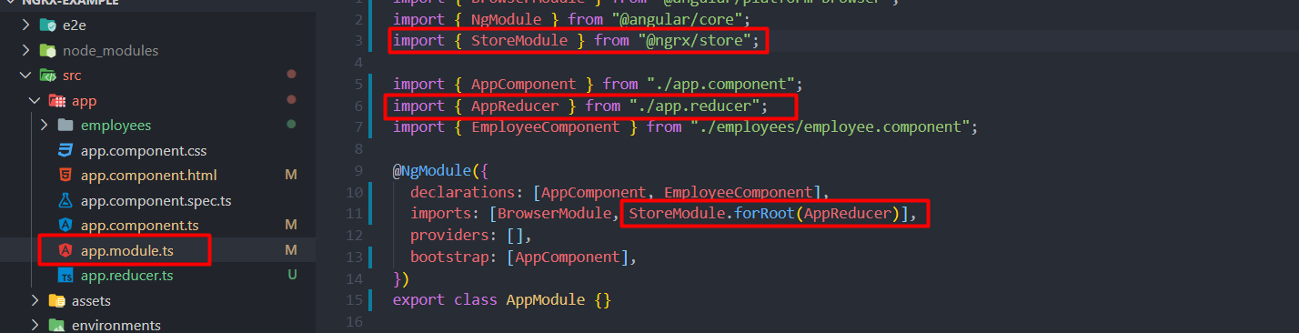 10. Add StoreModule from @ngrx/store and add into imports array. Also import AppReducer and set it inside the forRootmethod of StoreModule.StoreModule’s here will set our state, which we defined in app reducer in previous step. Hereby, we have set our NgRx basic structure for our application.