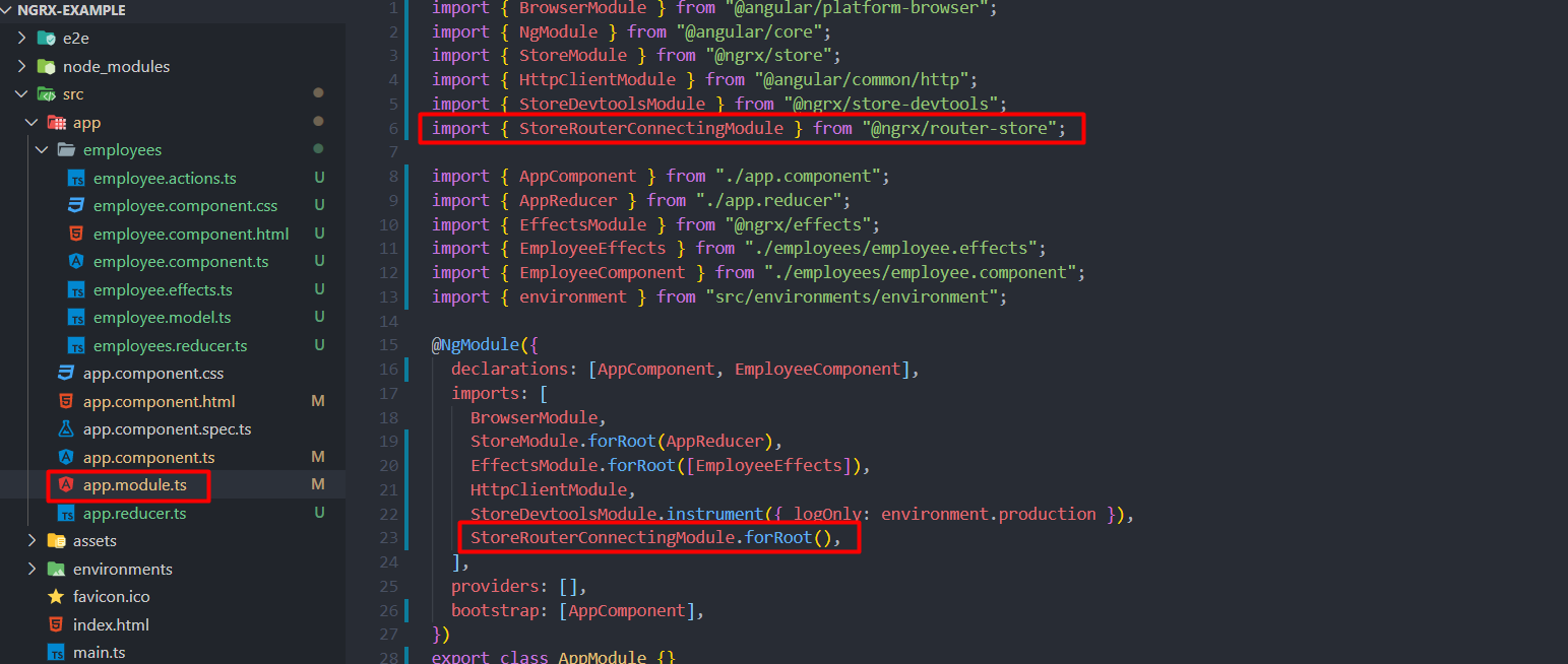 2. Now go to src/app/app.module.ts file and import StoreRouterConnectingModule from @ngrx/router-store.