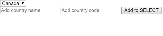 Now let’s assume that we need to add an input where users can add more OPTIONS for this SELECT. We will have two inputs where users can add country name and country code. After that new OPTION will be added to our SELECT and that OPTION automatically will be selected. So usually all OPTIONS from SELECT come from the server, so in a real world example you also need to add new OPTIONS to the server, do a POST request and get brand new data. In this example i will simulate it with setTimeout.