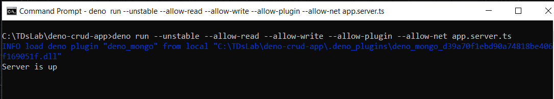 --allow-net app.server.ts- You should see the following message on your console which means your application is running.