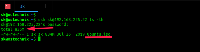 As you see in the above output, the file Ubuntu.iso is copied to the remote system and its size is 835MB.